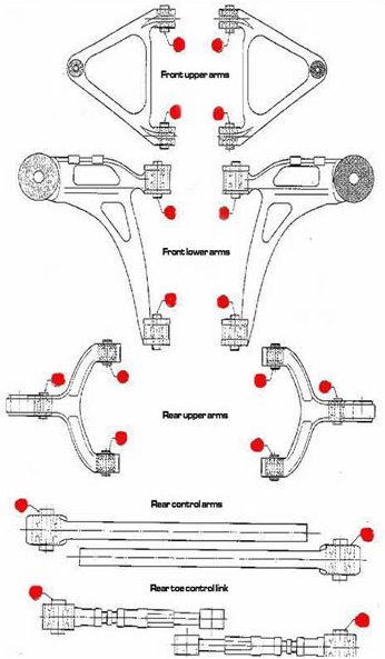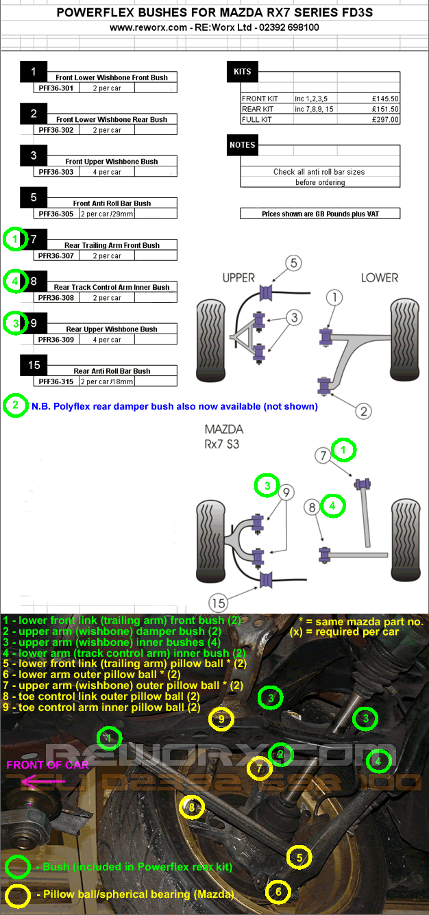 Excellent value upgraded bushes to replace: front lower wishbone bushes (4), front upper wishbone bushes (4), front anti-roll bar mount bushes (2), rear trailing arm front bushes (2), rear track control arm inner bushes (2), rear upper wishbone bushes (4) and rear anti-roll bar mount bushes (2). NB: these are replacement BUSHES - they do not replace Mazda pillow ball/spherical bearings where used